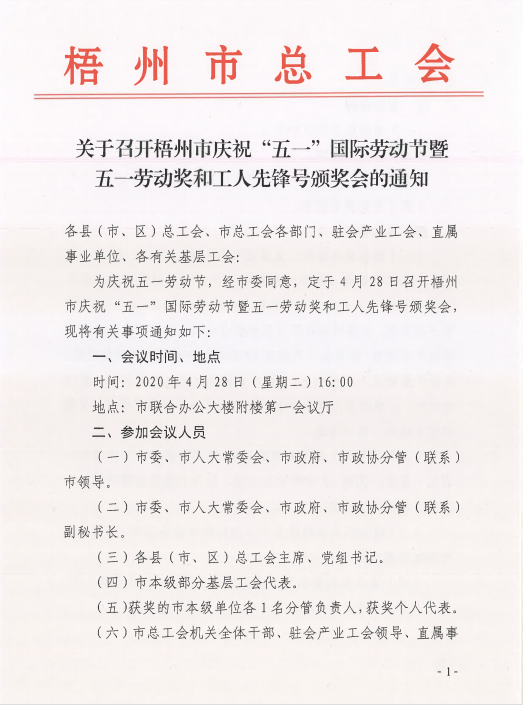 關(guān)于召開梧州市慶祝“五一”國際勞動(dòng)節(jié)暨五一勞動(dòng)獎(jiǎng)和工人先鋒號頒獎(jiǎng)大會的通知