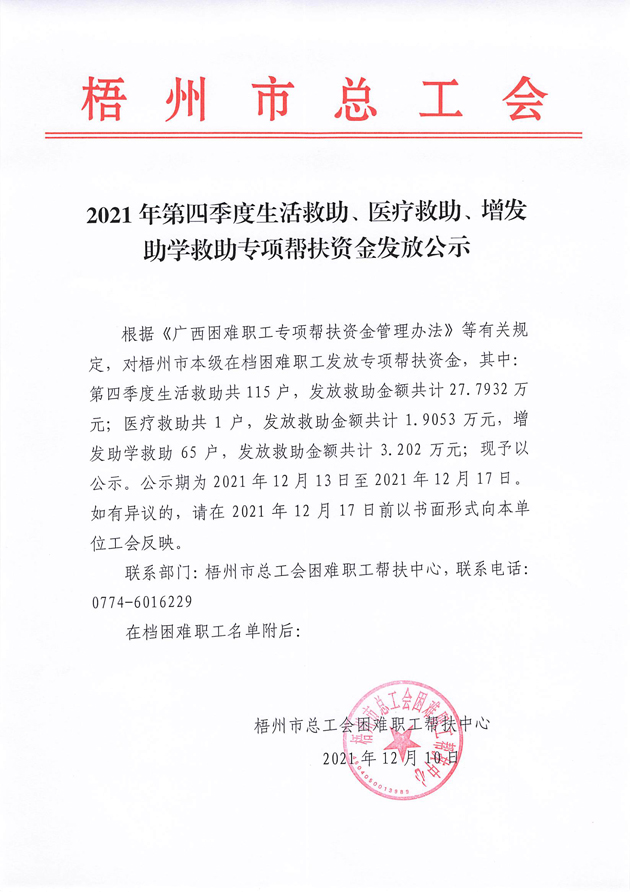 2021年第四季度生活救助、醫(yī)療救助、增發(fā)助學(xué)救助專項(xiàng)幫扶資金發(fā)放公示