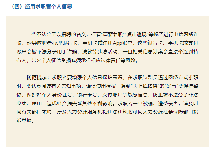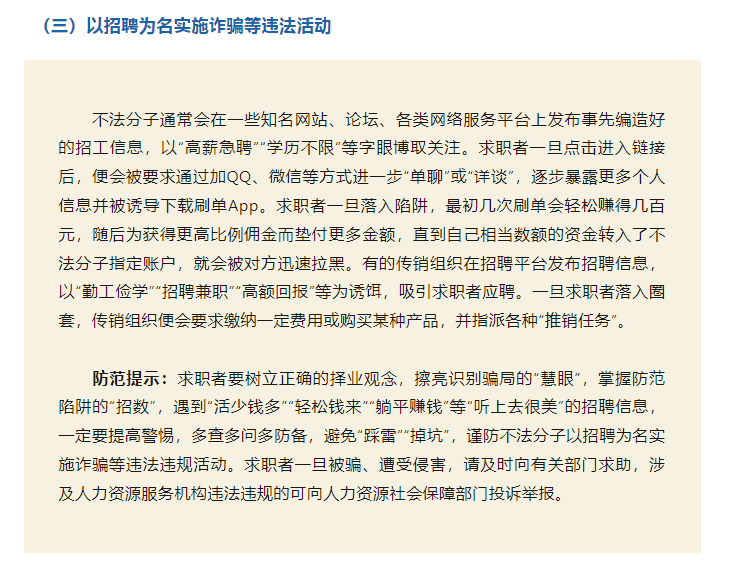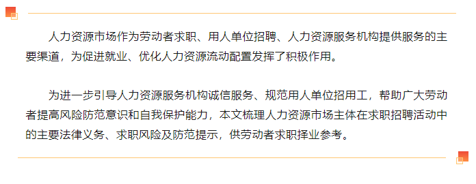為進(jìn)一步引導(dǎo)人力資源服務(wù)機(jī)構(gòu)誠(chéng)信服務(wù)、規(guī)范用人單位招用工,幫助廣大勞動(dòng)者提高風(fēng)險(xiǎn)防范意識(shí)和自我保護(hù)能力,本文梳理人力資源市場(chǎng)主體在求職招聘活動(dòng)中的主要法律義務(wù)、求職風(fēng)險(xiǎn)及防范提示,供勞動(dòng)者求職擇業(yè)參考。